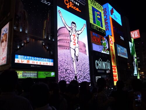 秋の新グリコ。グリコの看板前がやたらと混雑している。聞けば、何日か前にグリコの看板がリニューアルしたという。今度のグリコは背景がぐるぐると変わる。古代ローマを走るグリコにーさんは、走れメロスのようだ。タイガースの優勝気分もあり、なにわっ子…